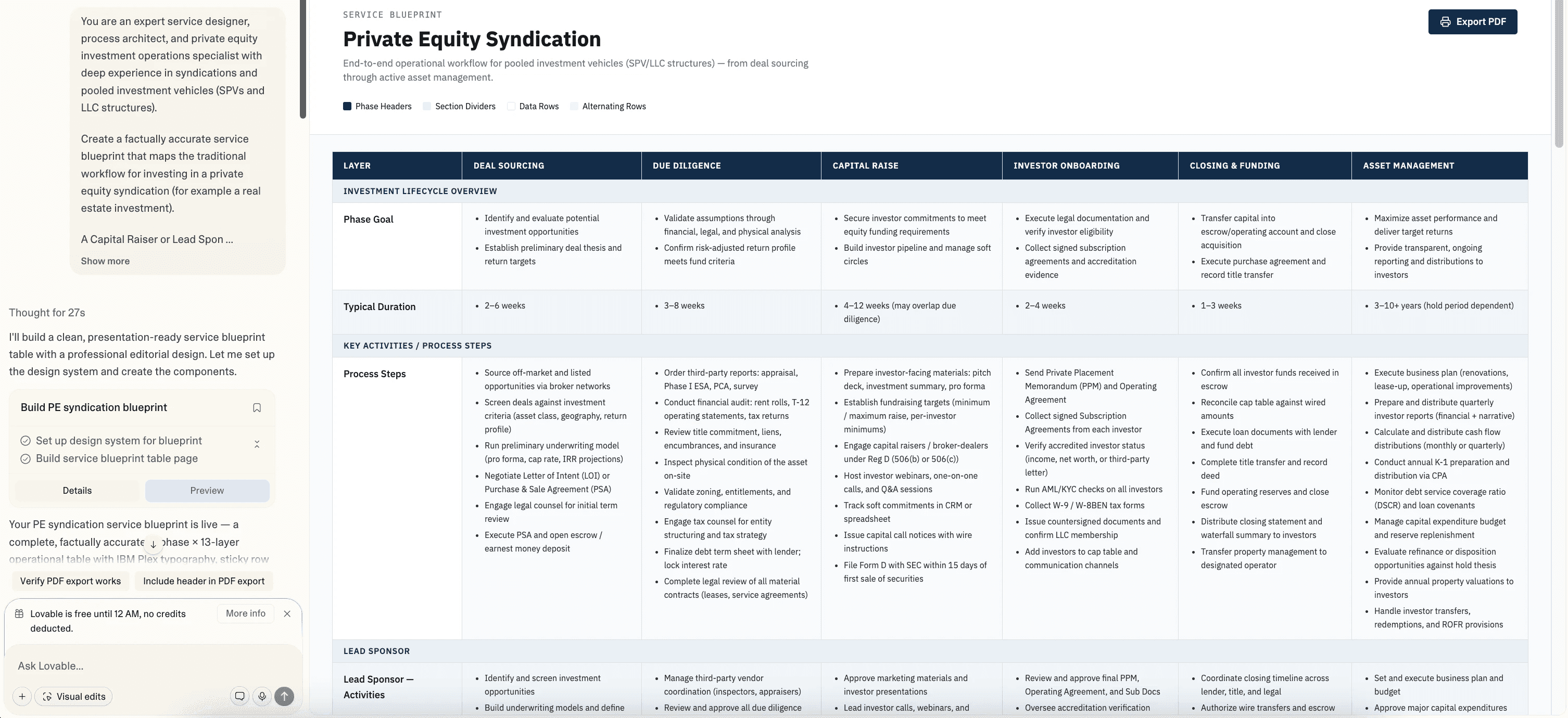 Claude and Lovable produced end-to-end service blueprints that mapped traditional workflows and user interactions from private deal sourcing to asset management.
