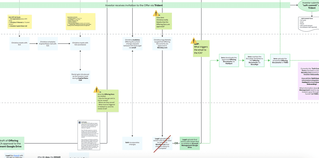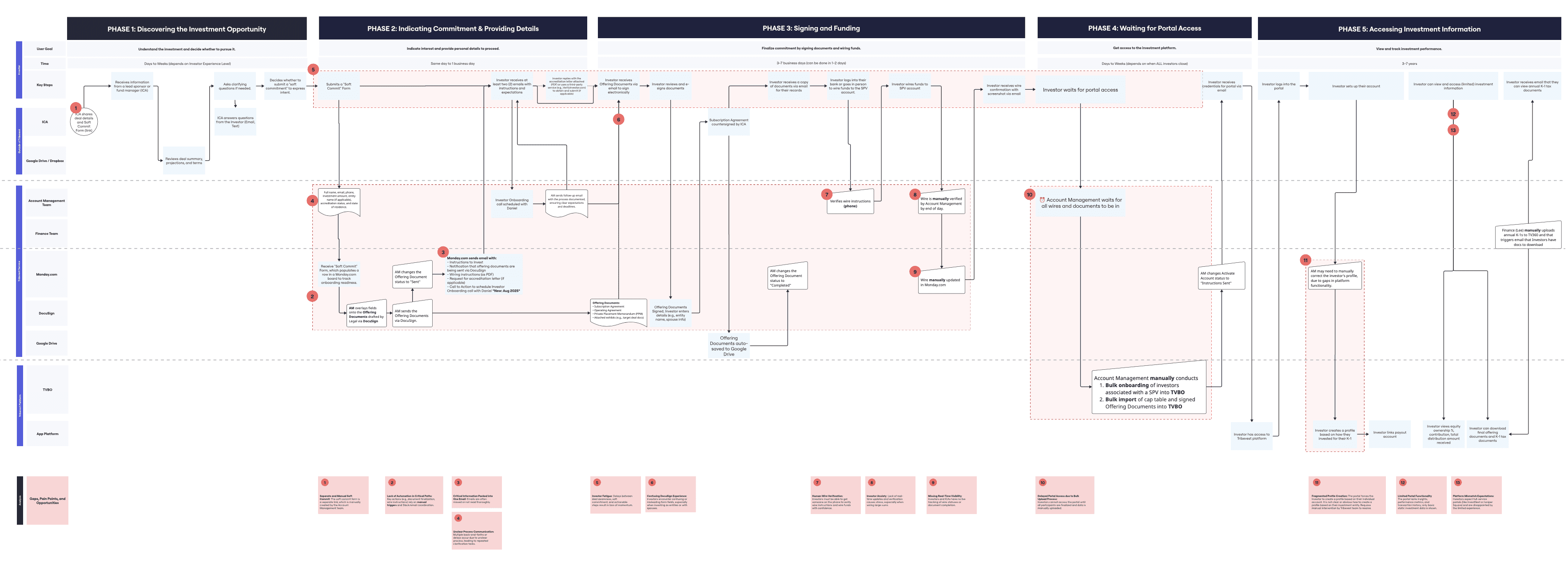 Scaling the business required introducing a digital platform to automate key workflows particularly around investor onboarding. However, introducing a new tool risked breaking internal workflows, raising the need to document and evaluate the end-to-end process.