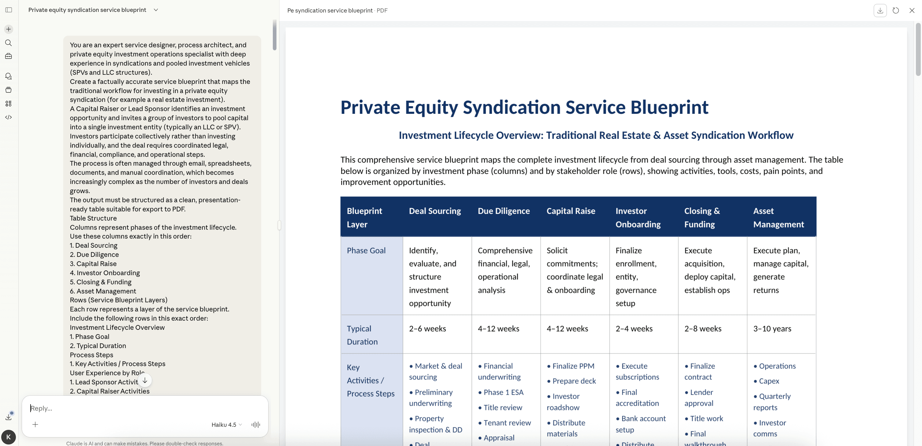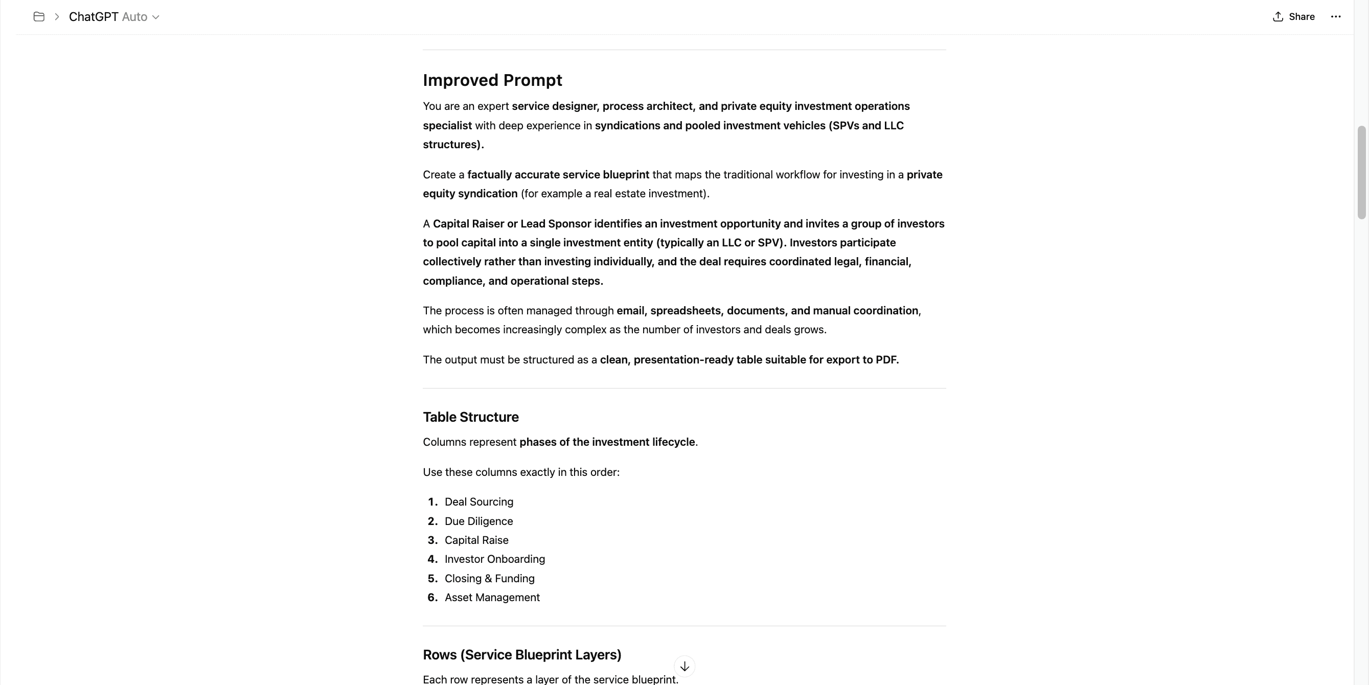 To understand the problem space end-to-end, I needed a service blueprint of the traditional private investing process. I created refined AI prompts with ChatGPT and then tested both Claude and Lovable to see which would generate a more useful output.